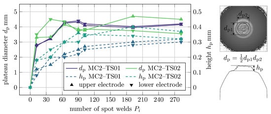 Axial flow that forms a plateau is shown in Figure 15, where a shift of the plateau out of the center occurred. Measuring plateau diameter and height proved that the plateau formation was happening after just a few spot welds, as shown in Figure 16 and already indicated in Figure 13. Plateau diameter was determined in the top view of the measurements by the mean value of longest diameter and perpendicular to it (Equation (10)). The plateaus show no numerical eccentricity. This allows the area of the plateau to be calculated by the conventional formula for calculating the area of a circle without any further restrictions (Equation (11)). is determined via profile sections of the electrodes. It should be noted that is immediately constant, whereas is gradually increasing. There are no significant differences between anode and cathode at MC02–TS01 and slight differences a MC02–TS02.