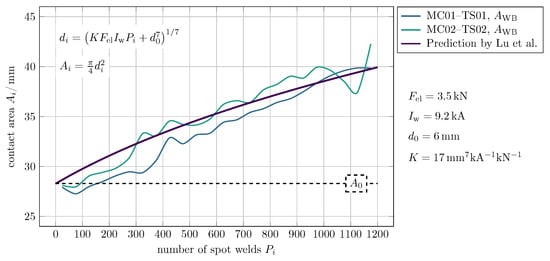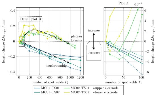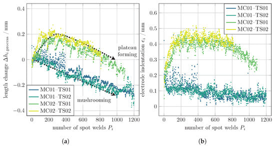 The results of determining electrode changes in length over the number of spot welds can be seen in Figure 17. As results show, decreased right from the beginning for MC01 with the wear mode of mushrooming, whereas for MC02, the length of the electrodes increased, caused by plateau forming; after about 300 spot welds, it began to slightly decrease. Constant after just a few welds led to persistently high and constant current density J through plateau area . In addition, the alloy layer forming on the electrodes caused poorer heat dissipation via the electrodes, resulting in more process heat remaining in the sheets, thereby leading to nuggets becoming thicker []. Analyzing MC02’s in regard to and , two different phenomena were identified. First, and approached each other at a roughly 4 diameter and were smaller than the initial diameter of the electrode contact surface. The softening of the region close to the electrode surface of the work pieces enabled axial material flow under the pressure of , which accelerated plateau formation but did not allow for to grow. The formation of a plateau led to deep electrode indentations e. With the second phenomenon, an explanation for the variation in (MC02) can be drawn by comparing the development of (MC02) in Figure 11 with the course of (MC02). As long as increased, (MC02) was stable. The progressive wear resulting in a decrease in starting at around 300 spot welds led to unstable (MC02). Interestingly, the decrease in appeared with the same gradients in both MC.