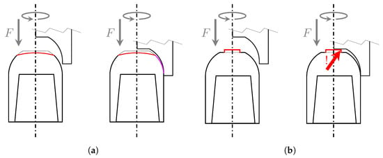 The wear mechanism by mushrooming is well-known [,,,,,,,,], as it has been around since RSW has been used. Briefly explained, due to thermomechanical stress on the electrode tips, radial material flow can be observed, as shown in Figure 3a. This acts together with a loss of material from the electrode tip surface to cause a decrease in electrodes length [,,,]. Material loss is repetitive by effects of the local melting, peeling, or breaking out of the brittle alloy layer, called pitting [,,]. Analytical models describing and predicting mushrooming are presented in [,,]. For trimming or plateau forming as the electrode wear mechanism, much less research can be found. One of the first publications on this was by Chang et al. [], describing trimming. Here, electrode length decreases due to the increasing number of spot welds. The mechanism of plateau formation was deeply investigated in [,,], where an increase in electrode length was shown. This wear mode occurs especially on applications with advanced high-strength steels (AHSS) such as hot-formed 22MnB5 with an aluminum–silicon coating (AlSi). Klages [] proved that the plateau is not created by the formation of an alloy layer, but by a consecutive deformation process of the electrode during welding. The wear mechanism is shown in Figure 3b. A higher temperature development in the center of the electrode contact surface locally decreases the strength of the electrode material. The surrounding material retains its strength. By displacing the material softened by the heating in the region of the nugget, the electrode material flows towards the direction of the nugget, and the plateau is formed.