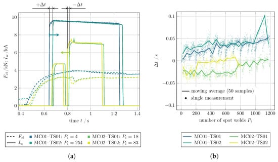 The welding equipment consisted of a servoelectric C-type welding gun with stiffness of . The welding current was provided and controlled by a medium-frequency inverter of using constant current control. The different number of spot welds of the TS between MC01 and MC02 resulted from the different geometrical dimensions and properties of the sheet metals. The target spot-weld diameter at the start of each test was chosen to be , where t is the thickness of the thinner sheet metal of the corresponding faying surface, determined by weldability lobes according to SEP 1220-2:2011 []. The chosen welding parameters are listed in Table 2. The process data for each individual weld were measured with a frequency of 100 . The measured process data and starting conditions were kept constant for each MC: