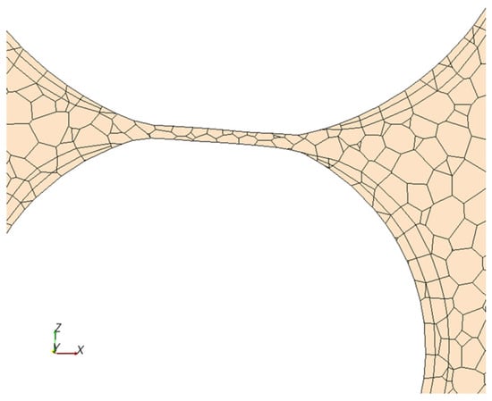 The mesh generation particle data (diameter and position of the centroid of each sphere) of the converged DEM simulation are transferred into a CAD geometry. To avoid the contact point problem, the local flattening method is used [15]. Figure 1 shows a small section of the generated mesh in the fluid domain; the mesh of the solid region is not displayed for the sake of clarity. The resulting gap width between two particles is equal to one percent of the particle diameter.