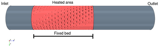 Reactor geometry overview for a particle diameter ratio of = 8.8: flow direction is from left to right. The red zone marks the heating area (constant temperature K) as well as the fixed bed. The upstream and downstream extrusion to minimize the influence of the inlet and outlet boundary condition is shown in grey.