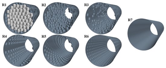 To understand the effect of macroscopic wall structures on the properties of the fixed bed, six different wall structures and one tube without wall structure were investigated. These structures are depicted in Figure 3 and consist of spherical caps derived from spheres with the same particle diameter cm as the particles in the packing. R7 is a plain tube without any wall structure and an ideal smooth wall is assumed. R4–R6 are tubes with wall structures with a regular arrangement of the caps like those used by Zobel et al. [10] in a previous study. The wall structure and the fixed bed particle arrangement of R1 is derived from the inner zone of a fixed bed with a large tube to particle diameter ratio () where the radial void fraction profile, averaged in circumferential direction and over the total height of the packing, already reached a constant value. This inner zone has been cut out by a cylinder. This means that all particles lying completely inside the cylindrical cut were kept and particles, which were cut by the cylinder wall were used as wall structure. The result is an absolutely irregular wall structure. For a better understanding, the procedure is outlined in Figure 4. R2 is based on the wall structure of R1, but the fixed bed is newly generated with an additional DEM simulation. R3 finally is based on the wall structure of R1 but all spheres whose centroid is located on the inner side of the tube are removed.