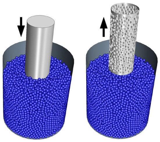 - Cundall, P.A.; Strack, O.D.L. A discrete numerical model for granular assemblies. Géotechnique 1979, 29, 47–65. [Google Scholar] [CrossRef]