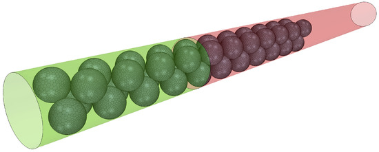 where , , and are the mass, velocity, mass moment of inertia and angular velocity of particle i, respectively. is the gravitational force acting on particle i. and are, respectively, the contact force and the contact torque acting on particle i due to its neighbor particles or neighbor boundaries that are in contact with particle i. The contact forces and torques are calculated using a spring-dashpot model. For these simulations, the non-linear Hertz–Mindlin model was used, where the forces and torques are calculated as a function of the parameters stated in Table 1. Further and more detailed information about the modeling can be found in the publication by Cundall and Strack [17] and in the user documentation of Simcenter STAR-CCM+ [18].