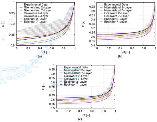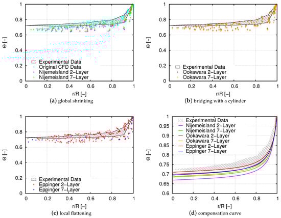 and fitting parameters A, B and C. In Figure 6d it can be seen that all models predict the temperature profile in the near wall region quit accurately. Towards the center of the tube all models underpredict the temperature with the largest deviation for the global shrinking method while the local flattening with two layers gives the most accurate result. Similar results are also found for Re = 373, 1724 and 1922, respectively, which are depicted in Figure 7a–c: