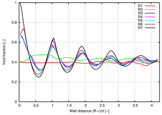 In Figure 8 the circumferential and over the bed height averaged radial void fraction distribution is shown. As expected for R1 the void fraction is constant over the radius while for R7, the tube without any wall structure, the well-known oscillating void fraction profile is obtained. The profile for R2 (same wall structure as R1, but particles are refilled) is also pretty homogeneous and the typical maxima and minima of the radial void fraction profile cannot be detected. Furthermore, the bed voidage is slightly higher than for R1 since during the filling process the imposed wall structure prevents the same dense packing as for R1 and additional voids are occurring. The profiles for R3–R6 are similar to the one of R7 but the minima and maxima for the curves are not so pronounced and the void fraction at the wall is lower, around . Comparing these four wall structures, it is obvious that the small caps of R6 have the lowest impact on the void fraction distribution while comparing R3–R5 with each other no significant difference can be found.