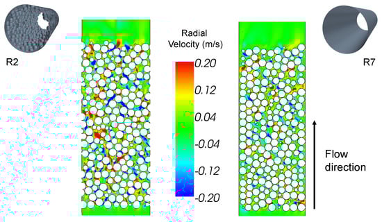 To address the question how a more homogeneous radial void fraction distribution affects the radial transport in the gas phase, a comparison of the local radial velocity in a plain section normal to the tube axis is shown in Figure 9. The range of the legend is adjusted for a better comparison in such a way that the radial velocity in red zones is equal or higher than m/s and in blue zones equal or lower than m/s. It can be clearly seen that, with wall structures, the zones where the radial velocity exceeds the maximum and minimum is much larger. As a result, it can be expected that the lateral mixing is increased due to the higher convective transport.