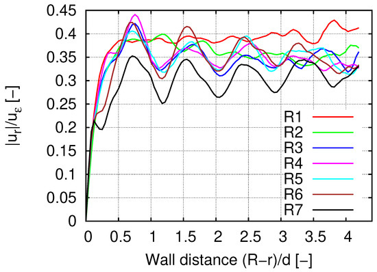 Averaged (circumferential and over the bed height) magnitude of the radial velocity component . A significant increase for configurations with wall structure can be observed compared to R7 (plain wall).