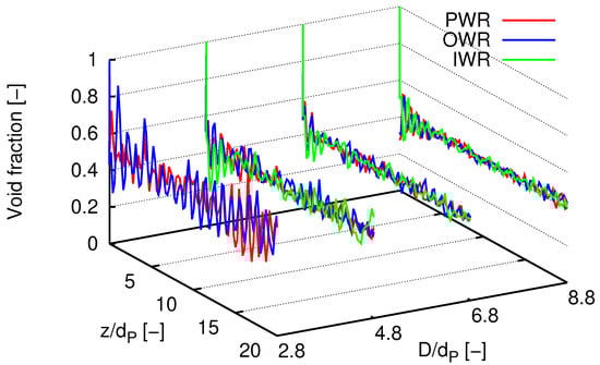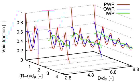 The radial void fraction distribution depicted in Figure 12 shows a significant impact of the different wall structures on the particle arrangement for all diameter ratios except for . Here, similar to the axial void fraction distribution the confining wall of the small tube determines the position of the particles. For larger -ratios the radial void fraction profile shows the same trend as discussed in the preliminary study section: Compared to PWR the OWR shows a more homogeneous profile with less pronounced peaks, while the positions of the minima and maxima are nearly unaffected. The irregular wall structure of the IWR leads to an almost constant radial void fraction distribution. The void fraction value at the wall decreases from for PWR over for OWR to for IWR for all -ratios.