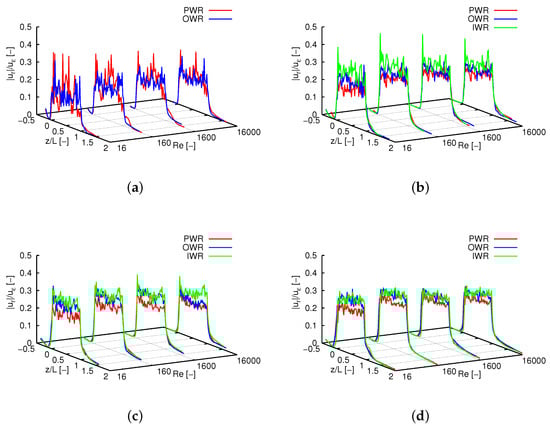 Figure 13 shows that for all investigated Reynolds numbers an increasing convective radial mixing can be observed for OWR and IWR compared to PWR. Only for a diameter ratio of this effect does not exist because of the same reason as discussed earlier. To get more quantitative information Table 6 shows the axially average values of in the range of .
