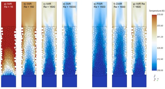 Figure 14 shows the temperature distribution in a cross section normal to the x-axis. The four plots on the left Figure 14a–d show the well-known parabolic temperature profile for tube reactors with varying Reynolds Number, although the ideal parabolic profile is disturbed by the presence of the solid particles. It can clearly be seen that with increasing velocity the core temperature along the z-axis stays longer with the inlet temperature. For the lowest velocity (Figure 14a) immediately at the packing entry the temperature rises. In contrast, for the highest investigated velocity (Figure 14d) even at the end of the bed the core temperature has not drastically changed. Comparing the three different configurations at in Figure 14e–g it can be clearly seen that the overall temperature for the plain wall configurations is the lowest. OWR shows a higher overall temperature, especially in the near-wall region. This is even more pronounced for IWR and leads to volumes close to the wall where the wall temperature is almost reached. This indicates a kind of dead zone or zone with a significantly reduced convective heat transport.