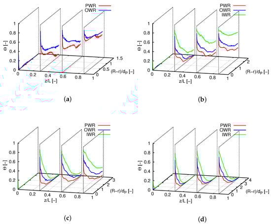 To get a better understanding of the temperature field, Figure 15 displays the circumferential averaged dimensionless radial temperature profile at four different axial positions within the fixed bed. Because of the huge amount of data, this is done for different tube to particle diameter ratios at a constant Reynolds number of Re = 1600. Similar trends were found for the other Reynolds numbers, too. For all configurations and all positions in the bed the PWR shows the lowest radial temperature profile and IWR the highest while OWR is somewhere in between. For both configurations with wall structure the temperature profile is smooth while for PWR steps in the profile can be seen, especially in Figure 15a,b. Again, this can be explained by the particle arrangement caused by the confining wall and its resulting radial void fraction distribution.