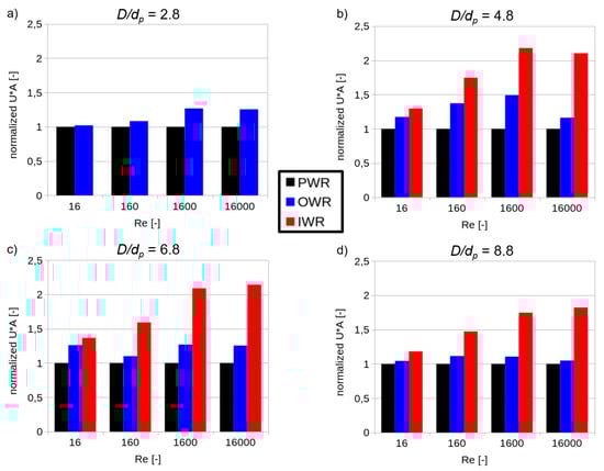 Similar results are found for = 6.8 in Figure 16c and for = 8.8 in Figure 16d. It should be noted that for the largest -ratio the improvement for PWR as well as for IWR is slightly reduced. This can be explained by the reduced importance of the near wall region with increasing tube diameter. For larger -ratios the heat transport in the center of the bed is getting more and more important and starts to dominate the performance. Since the local void fraction between the different tubes aligns to each other after approximately four particle diameters as shown in Figure 12, it can be expected that the UA values are equalized for much larger -ratios.