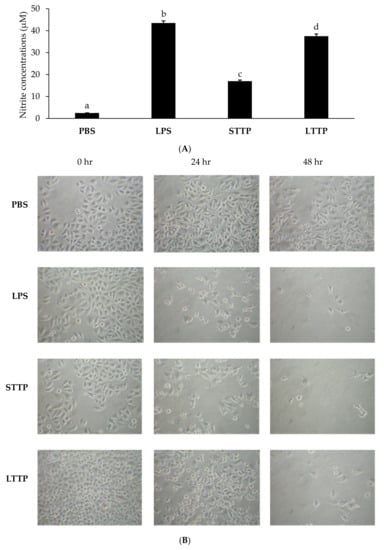 Nitrite concentrations in mediums of RAW264.7 macrophages treated with phosphate-buffered saline (PBS), 1 μg/mL LPS (LPS), 100 μg/mL STTP (STTP), and 100 μg/mL LTTP (LTTP) for 24 h (A). Values (mean ± SD, n = 3 for all test groups) in each column not sharing the same alphabetic letter are significantly different (p < 0.05). Images of human cervical cancer HeLa cells cultured in conditioned mediums (CMs) pre-treated with PBS, LPS, STTP, and LTTP for 0, 24, and 48 h (B).