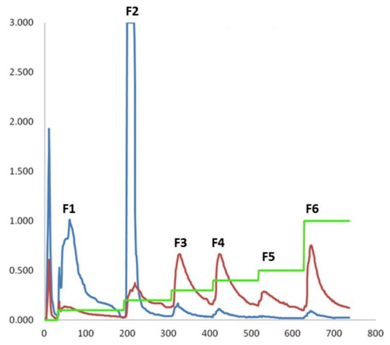 To purify and determine the effective components of LTTP, we separated LTTP into different fractions using anion-exchange chromatography. LTTP was injected into a DEAE-Sepharose Fast Flow column and then eluted by water and 0.1–1M NaCl step gradients. The fractionation of LTTP resulted in six main fractions as defined, namely F1 to F6 (Figure 2). The amounts of polysaccharides (blue line) and proteins (red line) were mainly concentrated in F1, F2, F3, F4 and F6. Because of the low concentrations of both polysaccharides and proteins, F5 was excluded from further studies. Therefore, the components and immunomodulatory effects of F1–4, and F6 were analyzed.