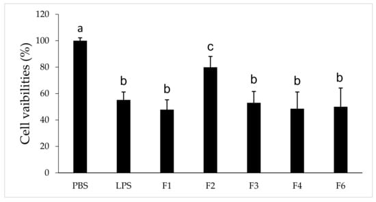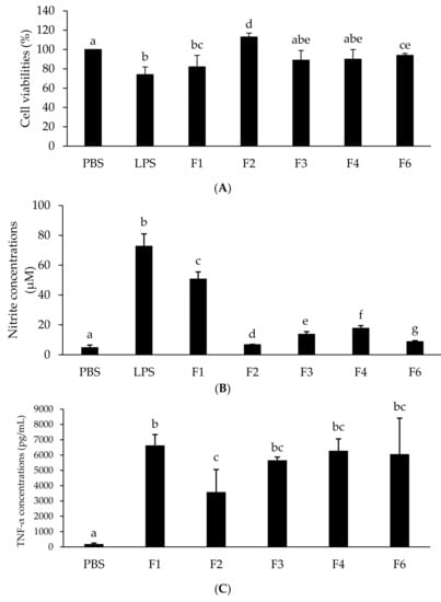 (A) Cell viabilities, (B) nitrite concentrations and (C) TNF-α concentration in mediums of RAW264.7 macrophages treated with PBS, 1 μg/mL LPS (LPS), and the same dose (100 μg/mL) of different fractions of LTTP (F1–F4 and F6) for 24 h. The cell viability using PBS-pretreated CM was designed as 100%. Values (mean ± SD, n = 3 for all test groups) in each column not sharing the same alphabetic letter are significantly different (p < 0.05).