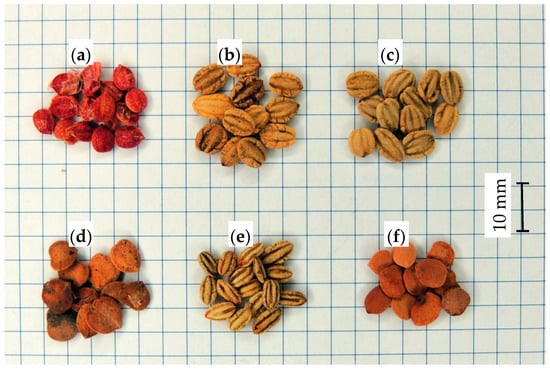The seeds of six Viburnum species were analyzed (Figure 1): V. dasyanthum Rehder, V. lantana L., V. lentago L., V. opulus L., V. rhytodophyllum Hemsl. and V. sargentii Koehne. Seeds for the experiment were supplied by two commercial distributors of seeds of forest trees and shrubs: Dendrona (Pęcice, Poland) and Florpak (Łomianki, Poland). Each seed sample weighed 200 g, and more than 100 seeds of each species were selected for analysis. Seeds were acquired by halving [31]. Every sample was divided into two batches, and one batch was randomly selected and halved. The process was repeated until the required number of seeds per sample was obtained. The analyzed samples consisted of 118 to 122 seeds each.