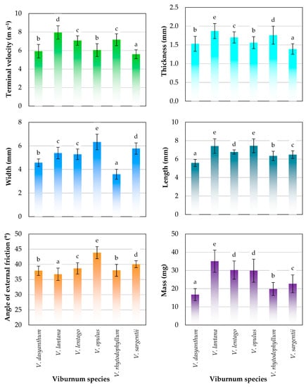 The average value of the volumetric coefficient of proportionality k measured with a liquid pycnometer was determined at 0.527 in V. dasyanthum seeds, 0.467 in V. lantana seeds, 0.514 in V. lentago seeds, 0.465 in V. opulus seeds, 0.513 in V. rhytodophyllum seeds and 0.489 in V. sargentii seeds. The basic physical attributes of viburnum seeds are presented in Figure 2. Terminal velocity ranged from 4.1 m s−1 to 9.6 m s−1, and the average value of this parameter was determined in the range of 5.6 m s−1 (Viburnum sargentii) to 7.9 m s−1 (Viburnum lantana). The following pairs of Viburnum species formed homogeneous groups in terms of terminal velocity: Viburnum dasyanthum and Viburnum opulus; Viburnum lentago and Viburnum rhytodophyllum. The terminal velocity noted in the first pair was similar to that reported in Picea pungens seeds [28] and Abies procera seeds [29], whereas the terminal velocity of the second pair approximated the values noted in Juniperus communis seeds [27]. In terms of terminal velocity, Viburnum sargentii seeds resembled Picea rubens and Picea glaca seeds [28] as well as Abies lasiocarpa, Abies forrestii and Abies concolor seeds [29], whereas Viburnum lantana seeds were similar to Juniperus virginiana seeds [27].