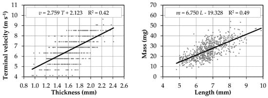 In general, seed mass was bound by the strongest correlation with seed length, followed by terminal velocity and seed thickness. The coefficient of determination describing the two latter correlations was determined at 0.49 and 0.42, respectively.