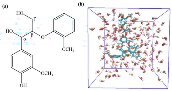 (a) Lignin model—Guaiacyl glycerol-β-guaiacyl ether (GGE) (b) The simulation box contains three GGE and 200 water molecules.