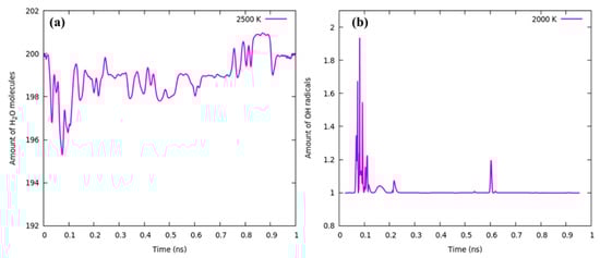 (a) Total number of water molecules (b) Amount of OH (hydroxy) radicals at 2000 K.