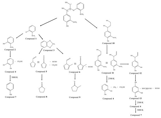 There are three possible reactions that can occur with increasing temperatures such as water molecules degradation alone, the reaction between water-lignin molecules and lignin degradation alone. These possible reactions were analyzed and the number of water molecules at 2000 K along with hydroxyl radicals is illustrated in Figure 2. The plausible reaction scheme of lignin degradation is demonstrated in Figure 3. Around 0.1 ns, the dissociation of the lignin model compound has occurred between the most fragile β-O-4 linkage and form compound 1 and compound 10. These corresponding radicals react with water and result in compound 2 and compound 11. The fragment analysis showed that there are some intermediates formed such as H4O2 (water dimer), H3O2 (H-O-H- - - O-H) along with OH radicals. However, we obtained higher water molecules (201 in total) in the range between 0.8 and 0.9 ns which is due to the fact of dissociation of methoxy and alkyl side chains in the lignin model into main products like, CH3OH and HCHO and formed OH radicals absorb protons from lignin model into H2O molecules. Furthermore, there are two possible reactions that occurred in lignin model (i) reaction between α-OH and β-H (ii) γ-OH and β-H to form compound 11 (Figure 3) by elimination of OH radicals which eventually form H2O in the following step. Compound 11 is one of the building blocks of lignin monomer, coniferyl alcohol. The methoxy groups present in the aromatic rings are relatively stable during the first pyrolysis reaction, however, they undergo breaking into isolated menthol molecules [48] in the successive pyrolysis reaction.