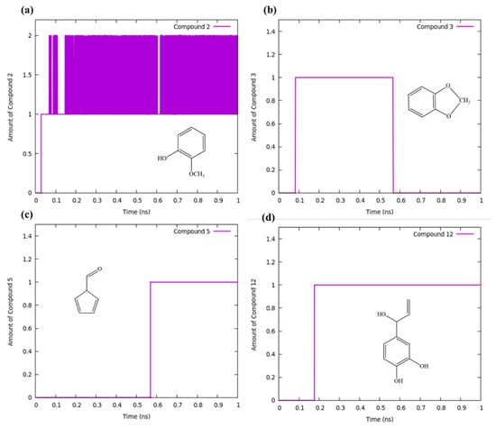 It is very interesting to see that the typical lignin model is predominantly formed of 4-methoxy substituted phenols (compound 2) or guaiacol at the primary stage of the gasification of lignin (Figure 4a). This result is in good agreement with the work described by Kawamoto [48]. In addition, the compound 1 radical can form a compound 3 which is known as 1,3-benzodioxole and is one of the products evolved at 2000 K. The 1,3-benzodioxole can be used as ingredients for fragrance industries and as a protective group in synthetic organic chemistry [49,50]. However, it can be seen in Figure 3 that it undergoes bond breaking and rearrangements and forming of compounds 5 and 6 which could lead to the formation of cyclopentenone (compound 8) and methyl-cyclopentanone (compound 9). In the case of compound 2, a dealkylation reaction was occurred to form compound 4, which is known as catechol and it further degrades to phenol. During the simulation, the evolution profile of compounds such as 2, 3, 5 and 12 have been extracted and shown in Figure 4. As can be seen from Figure 4b,c, 1,3-benzodioxole was formed at below 0.6 ns and afterwards. This compound 3 can be dissociated into compound 5 in which the amount of compound 5 was increasing from about 0.6 ns and stays until 1 ns. This is also confirmed that the cyclopentene-based compounds can be obtained from 1,3-benzodioxole.