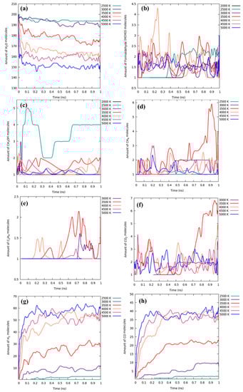 The number of the most dominant molecules: (a) Water, (b) Formaldehyde, (c) Methanol, (d) Methane, (e) Ethylene, (f) CO2, (g) H2 and (h) CO at different temperatures.