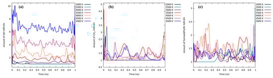 During the gasification of lignin, several compounds have been identified concerning different temperatures employed. The most dominant molecules with several concentrations are shown in Figure 5. With an increase of temperature, the number of water molecules decreased due to the formation of H and OH reactive radicals. At 5000 K, the number of total H2O molecules is about 150. The active OH radicals dealkylate lignin molecules and form formaldehyde compound (Figure 5b). Several authors have reported the formation of formaldehyde molecules by treating lignin with base and acid-based reagents [54,55,56]. Moreover, Toledano et al., have attempted to entrap the active formaldehyde molecules to avoid lignin repolymerization [55]. Although formaldehyde molecules are reactive, they dissociate at increasing temperatures into CO and H2. Methoxy groups in the aromatic ring are hydrolyzed with water into methanol and a higher concentration of these molecules is obtained at 2500 K (Figure 5c). However, over 2500 K, the concentration decreases due to degradation to methyl and ethylene radicals. The formed methyl radicals absorb H radicals from water at higher than 2000 K to form methane molecules. This process was not observed at a lower temperature than 2000 K. Afterwards, the number of methane molecules increased until 3500 K and dropped at higher temperature due to the dissociation of methane to H2 and CO. Similar trend was also observed for ethylene molecules (Figure 5e). Comparing the gases such as CO2, H2 and CO in Figure 5f–h, the higher the number of syngas (H2 and CO) was formed at the higher temperature. It is interesting to observe that no syngas was noticed at the temperature of 2000 K and a low amount of those molecules are predominant at 2500 K due to low dissociation. The observed number of CO and H2 molecules are consistent with the recent gasification study of γ-O-4 using ReaxFF [32]. In particular, the H2 molecules were generated from the water molecules present in the system through intermediate H radicals that evolved from water. The trend evidencing the amount of water and H2 is presented in Figure 5a,g, where water molecules decrease at the higher temperature. Simultaneously the generation of amount H2 molecules increases. The evolution of CO2 molecules can be seen from 3000 K because it is mainly generated from aromatic rings which required higher temperature for dissociation. Figure 6 demonstrates the number of hydroxyl, methyl and formaldehyde radicals formed at different temperatures employed in the simulation. The increasing temperature breaks water molecules more into radicals such as H and OH which greatly participate in the breaking of methoxy groups and hydroxyl groups present in the lignin. The more reactive methyl and formaldehyde radicals are formed at increasing temperature up to 3500 K. The methyl radicals belong to the aromatic methoxy group which undergoes cleavage at the second stage of the pyrolysis (after β-O-4 bond-breaking process) which then absorbs H or HO radicals from water to form methane or methanol respectively. At higher temperatures, it eventually produced H2 and CO gases. Similarly, formaldehyde radicals’ formation may originate from the hydroxyl alkyl chain of the lignin model (α-C or γ-C atoms) which lead to the formation of formaldehyde molecules before subjected to form syngas molecules at a higher temperature.