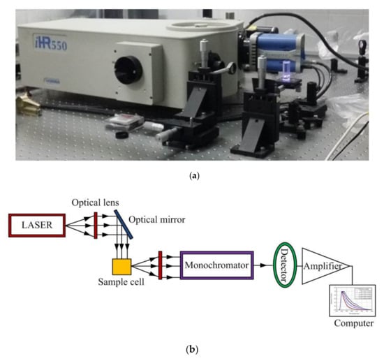 Experimental setup of photoluminescence spectroscopy: (a) Photoluminescence spectrometer setup and (b) configuration of photoluminescence spectrometer.