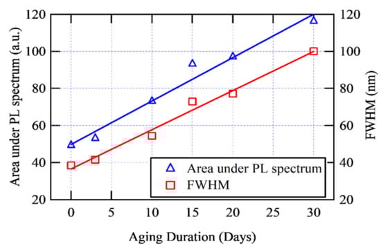 The increment in FWHM and in the area under PL spectra of different transformer oil samples with different aging durations.