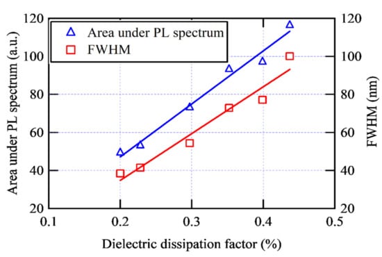 DDF is usually used to assess the evolution of aging byproducts in transformer oil. As the aging duration increases, transformer oil decomposes and aging byproducts are generated. Consequently, DDF increases with aging [8,9]. Accordingly, by correlating PL spectra with DDF, the effectiveness of PL spectroscopy in assessing the aging condition of transformer oil can be evaluated. Figure 6 shows the correlation of FWHM and APL deduced from PL spectra with DDF. The DDF increased from 0.2% for the fresh sample to about 0.23% for the sample aged 3 days. The DDF continued to increase against aging until attaining about 0.44% after 30 days of aging. In addition, it was found that both APL and FWHM increased as the DDF increased. In other words, these parameters could reflect the increment in the aging byproducts in transformer oil and thus its aging condition. With the linear fitting of FWHM and APL with DDF, it was found that the correlation coefficients of FWHM and APL with DDF were equal to 98% and 99%, respectively. These correlations are extremely high and validate the effectiveness of PL spectroscopy in the proper condition assessment of transformer oil.