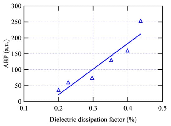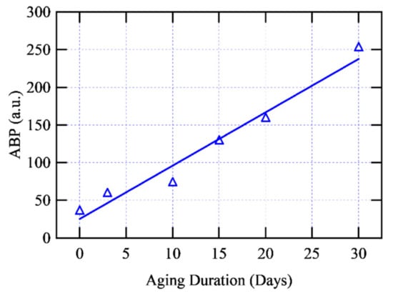 For quantitative analysis, the ABP was evaluated for each sample by calculating the area under UV-Vis absorption spectrum over the wavelength range from 360 nm to 600 nm according to the ASTM D6802 standard [33]. The results are depicted in Figure 8. The ABP was measured at 35 a.u. for the fresh oil and increased continuously against aging duration until reaching about 252 a.u. after 30 days of aging. To evaluate the effectiveness of UV-Vis spectroscopy in assessing the transformer oil condition, the ABP deduced from UV-Vis spectra was correlated with the DDF as shown in Figure 9. It was found that the ABP increased as the DDF increased. However, in this case, the correlation coefficient for linear fitting was found to be 94%, which is less than the correlation coefficients associated with the parameters deduced from the PL spectra. Thus, PL spectroscopy showed a higher correlation than the UV-Vis spectroscopy with DDF. It is clear that PL spectroscopy is more effective in the condition assessment of transformer oil than UV-Vis spectroscopy.