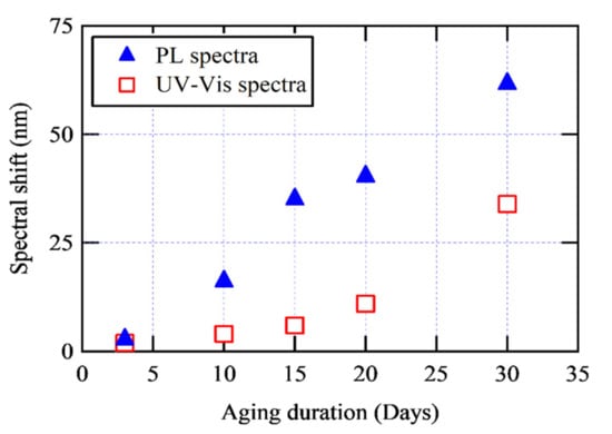 The spectral shift against aging duration for PL and UV-Vis spectra.