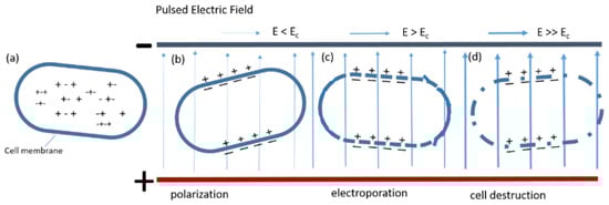 Biological cell membranes, filled with low permittivity dielectric material, could be considered as capacitors, maintaining an electrochemical gradient on both sides due to the accumulation of negative ions at the inner surface, and the presence of an equal number of positive ions outside. This builds a transmembrane potential (“resting potential”) across the membrane wall. After exposure to an external electric field of sufficient intensity, ions within the membrane migrate toward the outside, with accumulation of free charges at both sides of the wall, increasing the potential difference across the membrane. The additional transmembrane potential induced by the electric field, larger than the natural one, is unevenly distributed over the membrane surface. Upon locally reaching a critical threshold value (Ec) of overall transmembrane potential (sum of the externally induced and resting potentials), breakdown of the cell membrane (i.e. electroporation) occurs with formation of micropores that increase permeability and may eventually result in membrane rupture [19], as schematized in Figure 1.