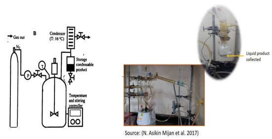 The DO of WCO was performed in a 250 mL mechanically stirred, semi-batch reactor, as shown in Figure 2. For each run, 10 g of WCO and 5 wt.% of the synthesized catalyst were placed in the reactor, as reported by Wan Khalit et al. [24], who stated that the reactor must be purged with N2 gas to extract the O2 from the air created during the heating process, by setting the temperature to 350 °C and run-time of 3 h. The condensed liquid product was subsequently deoxygenated and stored in the collection vessel placed after the chiller. After the reaction was completed, the reactor was cooled to an ambient temperature, while the contents of the vessel collector and round bottom flask were weighed [10]. Lastly, the products were analysed by gas chromatography-flame ionization detection (GC-FID).