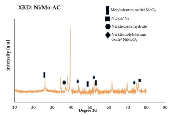 Figure 3 shows the XRD pattern of the analysed Ni-Mo/AC catalyst. There is an adjacent graph to the XRD peak distance, which is ascribed to the high crystallinity and clear elements of the mesoporous Ni-Mo/AC structure. Based on the graph, the intense peaks of MoO2 appeared at 2θ = 26.033°, 37.121°, 49.498°, and 53.888° (JCPDS card no: 00-002-0422). However, the NiOOH peaks were located at 2θ = 37.281°) (JCPDS card no: 00-006-0141). Furthermore, the visible peaks of Ni were found at 2θ = 44.349°, 51.674° (JCPDS card no: 00-001-1272), whereas the NiMoO4 peaks were observed at 2θ = 77.405°, 44.142°, 52.488° (JCPDS card no: 0120348). The results are in agreement with Wu et al. [28], who reported that the successful impregnation of NiO and MoO greatly reduced the amorphous structure of AC. Hence, the overlap of both species in AC ultimately promotes greater dispersal in the AC-based catalyst.