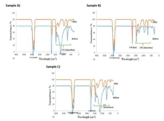 FTIR spectra of the deoxygenated sample (A–C) liquid product catalysed.