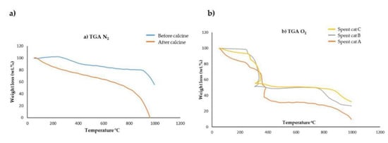 The degree of coke formation was investigated by TGA. In this study, the degree of coke formed on the Ni-Mo/AC catalyst is shown in Figure 5. Based on Figure 5a-(TGA N2), the calcined catalyst is defined by a shorter period or phase of coke formation and temperature range compared to the catalyst before calcination. The formation of coke on the external surface of the catalyst during the reaction degraded the DO activity. Hence, the results revealed that the bimetallic Ni-Mo/AC catalyst promotes superior resistance towards coke formation. The findings are in agreement with Wan Khalit et al. [24], who reported that the XRD and TGA confirm that the bimetallic Ni-Mo/AC has potential catalyst stability and prospects for further application at pilot-scale, due to its long-life and reuse. Figure 5b—(TGA O2) shows that the spent catalyst sample A exhibits a decomposition peak in the range 245 °C to 347 °C. For sample B, the decomposition peak was from 252 °C to 319 °C, whereas sample C was from 271 °C to 324 °C, which is linked to the combustion of the AC bulk nanorod. In general, all the spent catalysts showed rapid weight loss due to the decomposition temperature at 700 °C, which indicates the oxidation of coke in air.