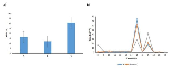 The DO reactivity of WCO over Ni/Mo-AC catalyst is shown in Figure 7a,b. Based on Figure 7a, sample C shows the highest yield of 31%, followed by sample A (17%) and sample B (12%). The significant values imply that the catalytic DO reaction was successful. The dark WCO showed the highest selectivity of DO due to the energetic effect of bimetallic Ni/Mo on the AC nanorod, which enhanced the properties of the acid-base sites. Figure 7b shows the comprehensive overview of the distribution of hydrocarbon portions from n(C8–C20) for the liquid DO products. The WCO consisting of ~45.68% C16 and ~52.34% C18 for fatty acids is typically converted to hydrocarbon portions comprising nC15 and nC17 by deCox pathways that are consistent with Bezergianni et al. [30].