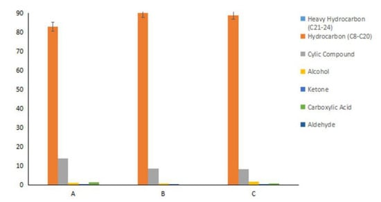 The comprehensive distribution of products for all three WCO conditions using the Ni-Mo/AC catalyst at 350 °C is shown in Figure 8. According to the GC-MS results, the arrangement of the highest hydrocarbon fraction produced in the n(C8‒C20) range started from sample B (89.93%) > sample C (88.84%) > sample A (82.81%). Lam et al. [31] reported that GC-MS analysis allows for easy detection of isomers based on the mass of the fragmented compound as suggested by the National Institute of Standards. Furthermore, the results of the different range of n(C8‒C20) hydrocarbons obtained from both GC-MS and GC-FID confirm that the straight-chained (saturated and unsaturated) hydrocarbons were mostly found in the liquid DO product. This result is in agreement with the finding in Section 3.3. However, a small amount of bulky C21‒C24 hydrocarbons and oxygenated intermediates (such as aldehydes, ketones, alcohols, and carboxylic acid) were also detected. As reported by Silva [32], WCOs undergo various procedures to achieve a perfect breakdown of triglycerides into mono-chains (free-fatty acid). Other products include oxygenated DO intermediates, aldol condensation, ketonization and hydrocarbon deoxygenated cyclisation.