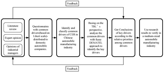 The proposed model framework for analyzing the drivers of CER in China’s automobile industry is shown in Figure 1. First of all, with the help of existing literature, expert opinions and industry managers’ opinions, most of the drivers were collected. Second, a questionnaire containing the drivers of the five-point Likert scale was distributed to Chinese automobile companies. For the collected valid questionnaires, we averaged the survey results, discussed with experts, and finally identified and classified 16 common driving factors. Then, based on the TBL, a fuzzy direct relationship matrix was established, and the key drivers of CER in CAMI were analyzed using the DEMATEL program. Finally, the results were verified in a medium-sized automobile company through feedback from the automotive industry managers and comparison with existing literature.
