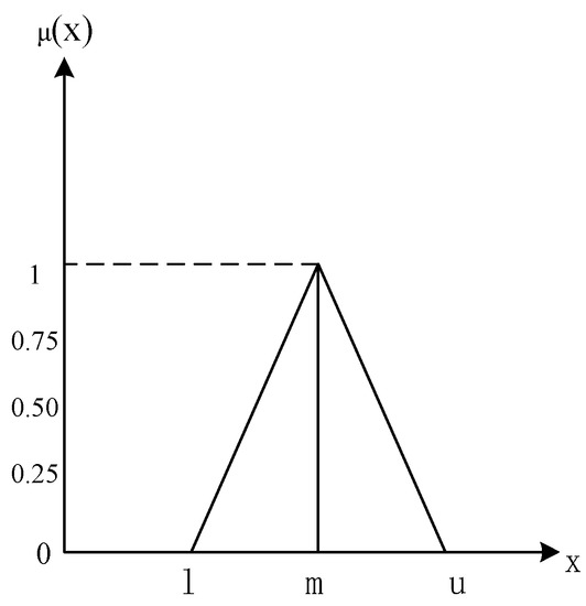 A triangular fuzzy number can be defined as a triplet , where , and denote lower, medium, and upper numbers, respectively, to describe a fuzzy event. Additionally, the membership function of a triangular fuzzy number can be expressed as follows: