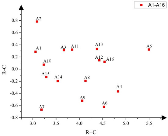 Step 6: Establish the cause–effect relation diagram. In the final step, the cause and effect relationship diagram is depicted according to the dataset of . The horizontal axis (R + C) is obtained by adding R to C, and the vertical axis (R − C) is obtained by subtracting C from R.