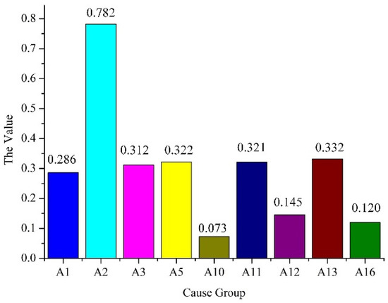 According to the results of the questionnaire, a fuzzy direct relationship matrix in the form of fuzzy linguistic terms can be established. The fuzzy direct relationship matrix is shown in Table 3. Using the centroid method, the fuzzy direct relationship matrix is defuzzified into clear numbers, and transformed into the initial matrix (Table 4), and the normalized direct relationship matrix (Table 5) is established according to , and then the total relationship matrix is established (Table 6), and the row sum and column sum of the total relationship matrix are calculated. Finally, a causality diagram is established, the results of (R + C) and (R − C) (Table 7) are calculated and used as the horizontal and vertical axes of the causality diagram, as shown in Figure 3.