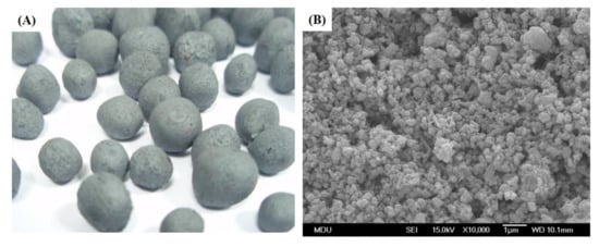 The Fe3O4 metal oxide co-catalyst used in this study consisted of circular granules with a diameter of approximately 0.3 cm (Figure 2) and was adopted as the microwave heating co-catalyst. The surface morphology of the Fe3O4 co-catalyst was analyzed by SEM, since particle size is an important factor in microwave heating [,,]. Before being loaded into the SEM chamber, the Fe3O4 co-catalyst was coated with a film of Au for 120 s to avoid electron accumulation and discharge due to its low electrical conductivity. The surface morphology of the Fe3O4 co-catalyst is shown in Figure 2. In the SEM microphotograph (Figure 2B), it can be observed that the Fe3O4 nanoparticles are mostly uniform with a size of approximately 100 nm.