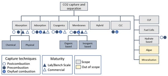 Absorption | It can be classified as chemical or physical. In the first case, a chemical reaction occurs between an absorbent molecule and CO2. In the second case, the physical solvent readily incorporates and dissolves CO2, and weak binding forces between gas and solvent molecules keep CO2 in solution. Regeneration is frequently performed through pressure swing [129,160]. |