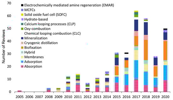1 | An overview of current status of carbon dioxide capture and storage technologies Authors: Leung, D. Y., Caramanna, G., and Maroto-Valer, M. M. Source: Renewable and Sustainable Energy Reviews (2014) | Capture and use | Absorption Adsorption CLC 1 Membranes Gas hydrates Cryogenic distillation Chemical conversion EOR 3 and/or ECBM 2 | 1697 | [105] |