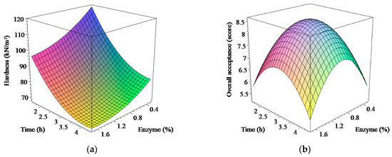 Three-dimensional response surface plots for hardness and overall acceptance with regard to the independent variables are shown in Figure 1. The effects of enzyme concentration and immersion time on the response (hardness, overall acceptance) are shown in Figure 1a,b, respectively, when enzymatic treatment was employed for muscle softening of texture-modified yellowfin sole. Specifically, Figure 1a demonstrates that hardness decreased with an increase in factors (enzyme concentration and immersion time) in a linear manner (Table 3).